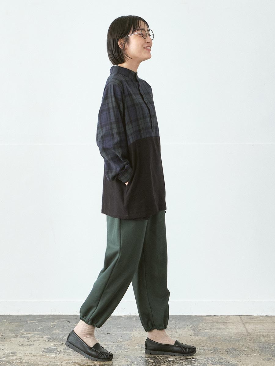 シルエットはゆったりとしつつ、裾にぐるりとゴムを入れ、きゅっと絞られたメリハリのあるデザインに。