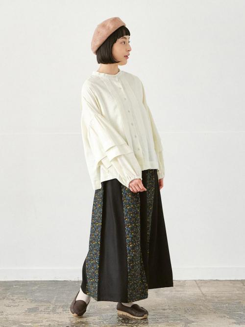 麻レーヨン生地を使用したバンドカラーブラウス。
